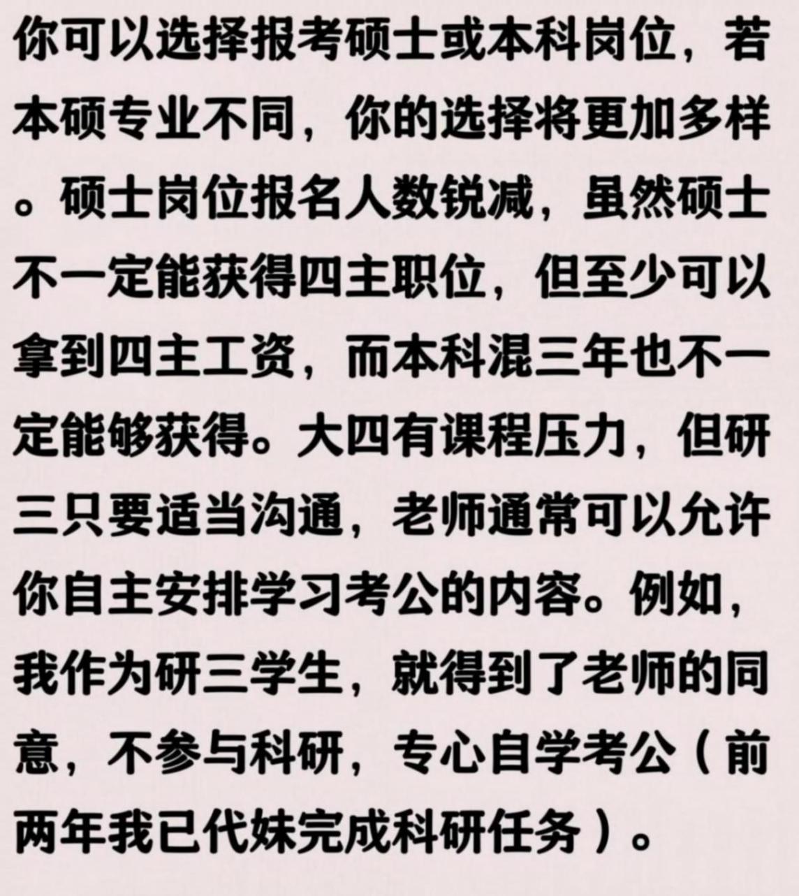 社招公務員,研究生幾乎沒有人考得過長期準備(一般在大二就培訓)的本科生,因為學術研究試驗非常費時艱苦!