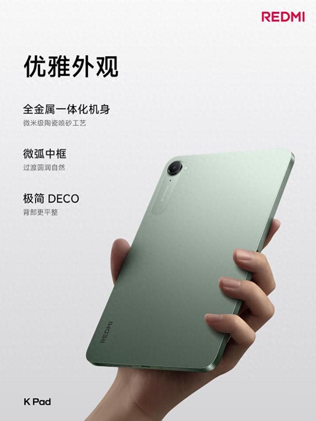 紅米K Pad共有3種配色,分別是云杉綠、煙霞紫和深邃黑,采用全金屬一體化機身,直角邊框,攝像模組附近采取拼接設計,極簡機身沒有多余點綴。