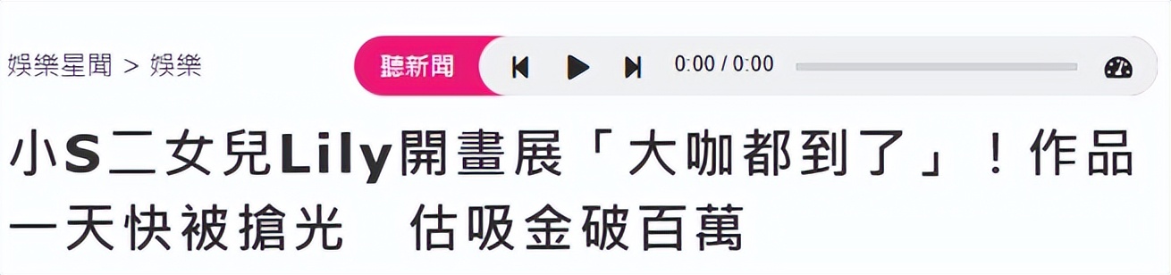 據臺媒爆料,17歲的Lily在6月29日舉辦個人畫展,展出了25幅畫作,現場人員爆料,畫作幾乎被搶購一空,大部分都賣掉了,售價在1萬到10萬臺幣。