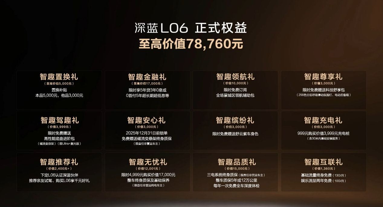 11月18日,正式上市,共推出4款車型,官方指導價13.49-15.69萬元,限時驚喜價13.29-15.49萬元。同時官方還推出了至高價值78760元的購車權益,此外2025年11月30日前鎖單,非客戶原因導致跨年交付的,購置稅差額由深藍汽車承擔。