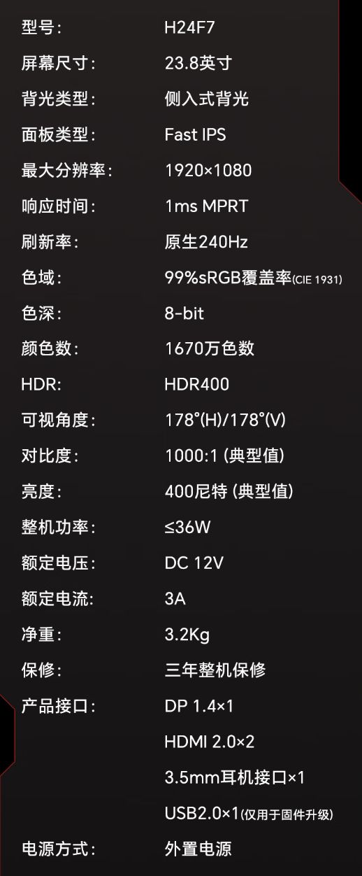 接口方面,該產品支持 DisplayPort1.4 x 1(1920x1080@240Hz)、HDMI 2.0 x 2 (1920x1080@240Hz)、3.5mm 耳機接口 x 1,包裝內標配 HDMI 線,支持 HDMI2.0 接口的主機和筆記本電腦外接顯示器可直接使用。