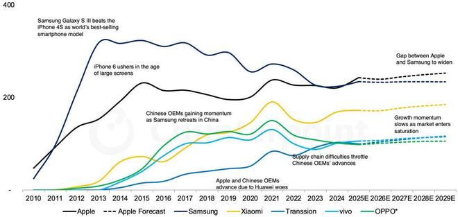 報告認為,三星 A 系列通過更強配置及更具競爭力的定價策略,將進一步強化三星在新興市場的增長動力,尤其是在印度、東南亞、中東和非洲等關鍵地區繼續保持穩健增長的背景下。在成熟市場,隨著高端化趨勢延續,加之北美、歐洲和東亞等市場基本面趨于穩定,三星有望在未來幾年維持市場份額。然而,盡管存在上述利好,面對中低端市場來自中國智能手機品牌日益激烈的競爭,三星在 2025 至 2029 年仍難以重新奪回全球第一的位置。