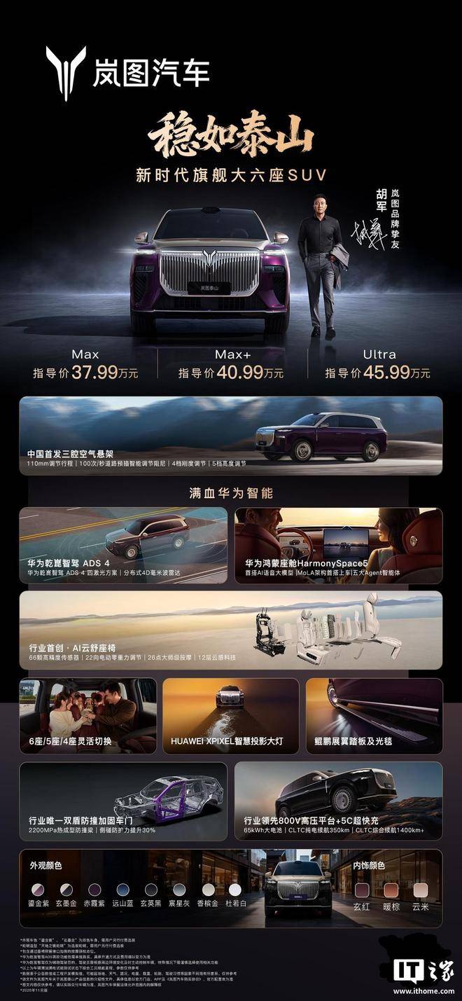 作為參考,嵐圖泰山旗艦 SUV 于上個月剛剛上市,新車搭載華為乾崑智駕 ADS 4 + 鴻蒙座艙 5、超感 AI 云舒零重力座椅(22 向電動零重力調節)、32 揚聲器天籟全景音響等,華系首搭三腔空懸,售價 37.99 萬元起。