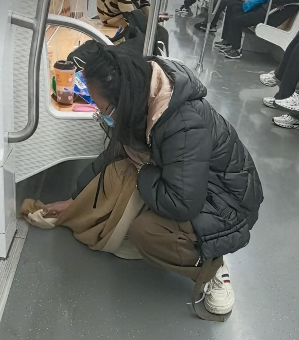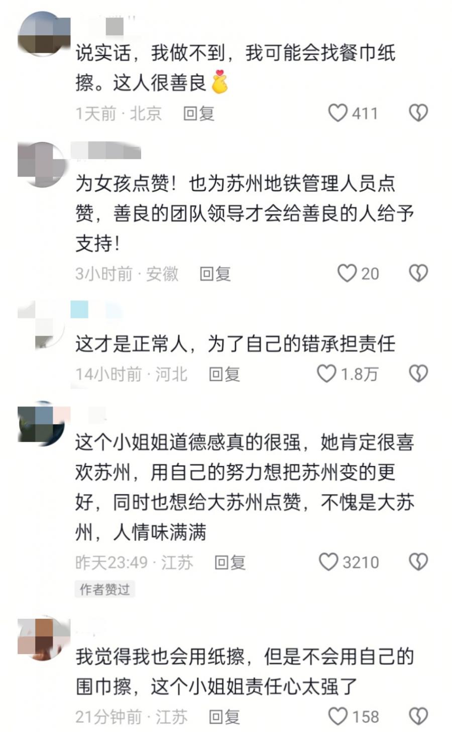 近日,江蘇蘇州一位姑娘在乘坐地鐵11號線時,不小心把手里的飲料灑了,對此她沒有不管不顧,而是負責任的用自己的圍脖,耐心的把椅子和地上都擦干凈。