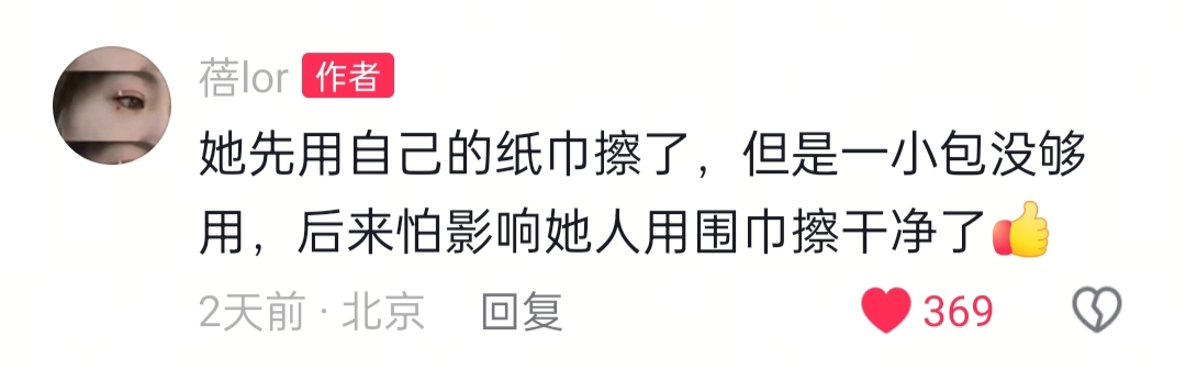 據發布這個視頻的人說,這位小姐姐先是用紙巾擦了,但是只有一小包沒夠用,后來怕影響別人,就用自己的圍脖把弄臟的地方擦干凈了。