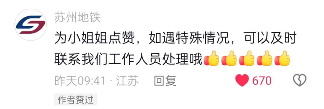 12月5日,視頻被蘇州地鐵知曉,并在視頻下評論:“為小姐姐點贊,遇到特殊情況可以聯系工作人員處理。