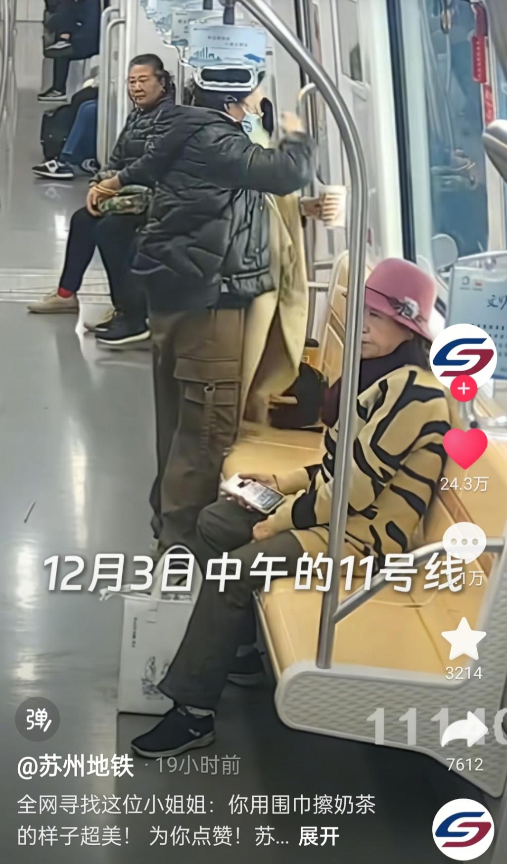 這讓人暖心的一幕,被同程的好心人拍了下來,并發到了網上,視頻中說:“看這個小姐姐,奶茶撒了用自己的圍脖擦,保持公共場所的衛生,值得贊揚!”