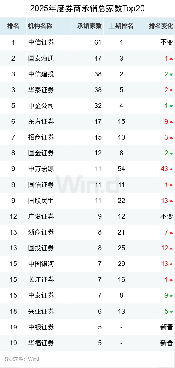 2025年度券商承銷總家數Top20排名中,頭部券商延續強勢格局。中信證券以61家的承銷數量蟬聯榜首,排名與上期持平,繼續鞏固行業“承銷一哥”地位;國泰海通從第3名升至第2名,承銷家數達47家;中信建投與華泰證券并列第3名,兩家承銷家數均為38家;此外,承銷數量超過30家的還有中金公司,“三中一華”與國泰海通成功占據行業前五席位。