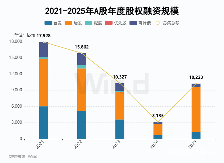 Wind數據統計顯示,2025年中國內地股票市場包含IPO、增發和可轉債等方式的全口徑募資事件共315起,較去年增加38起,合計募集金額突破萬億大關,達10222.68億元,同比增長226.10%。