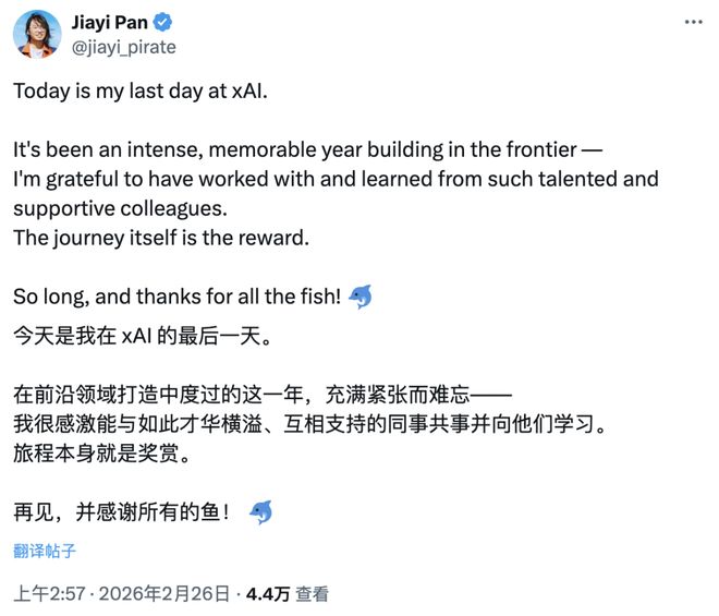 2月26日,xAI Grok 4團隊核心成員Jiayi Pan宣布離職